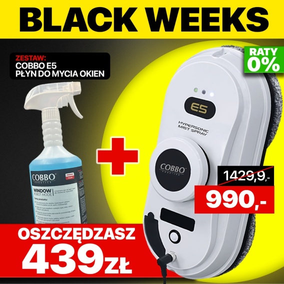 COBBO e5 to robot do mycia okien, który działa na wielu powierzchniach szklanych, płytkach ściennych i gładkich ścianach. Robot ten został wyposażony w funkcje automatycznego spryskiwania powierzchni czyszczących.