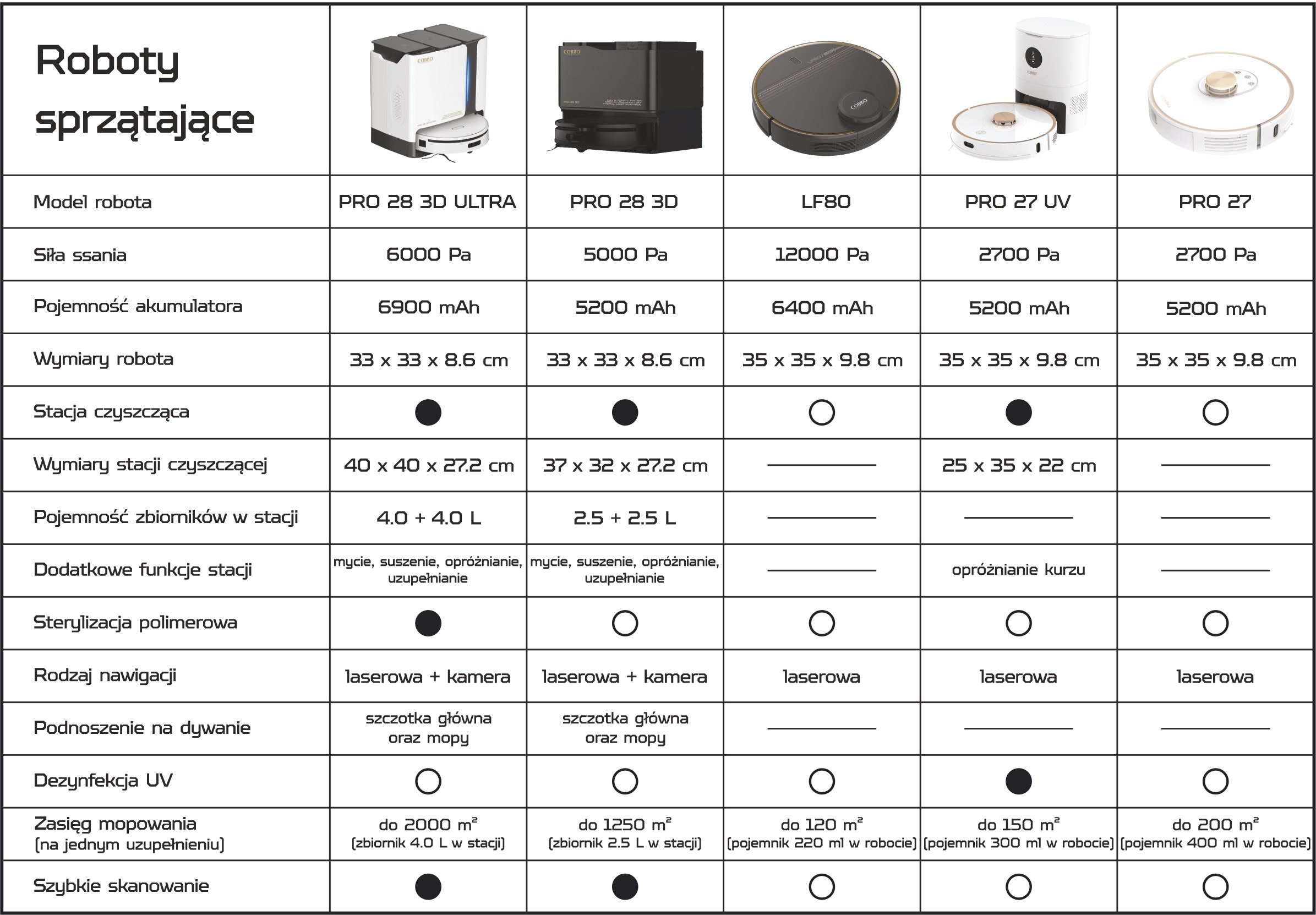 W poniższej tabeli przedstawiamy najważniejsze parametry techniczne oraz funkcje, w które wyposażyliśmy automatyczne roboty sprzątające.