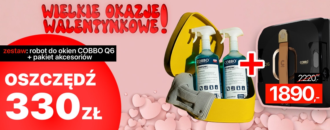 COBBO Q6 to robot czyszczący, który działa na wielu rodzajach powierzchni. Pracuje on na wbudowanym silniku próżniowym, który zasysa powietrze i tym samym utrzymuje się na płaskich powierzchniach. Wbudowany UPS (układ podtrzymywania zasilania) zapobiega upadkowi robota, nawet w przypadku braku energii elektrycznej. Dzięki AI-Inteligentnej technologii obliczania ścieżki, COBBO Q6 skutecznie czyści płaskie powierzchnie. Model Q6 posiada system automatycznego spryskiwania powierzchni Hypersonic Spraying System TM. Robot może być również obsługiwany ręcznie z pilota do zdalnego sterowania, aby czyścić w różnych trybach, zadanych przez użytkownika. Dużym atutem tego modelu jest zaimplementowana technologia Double Anti-Slip System TM umożliwiająca również pracę na mokrej powierzchni.